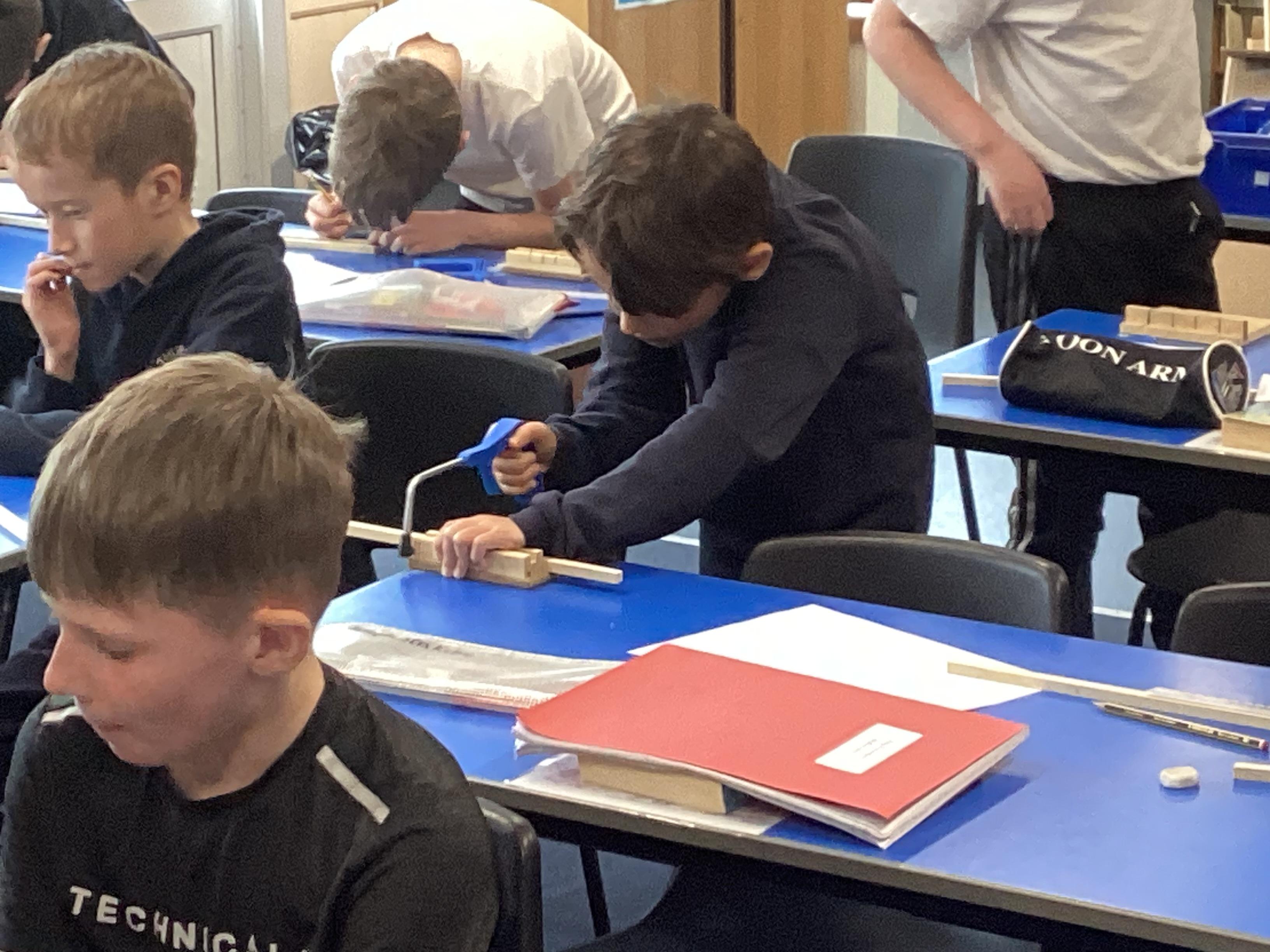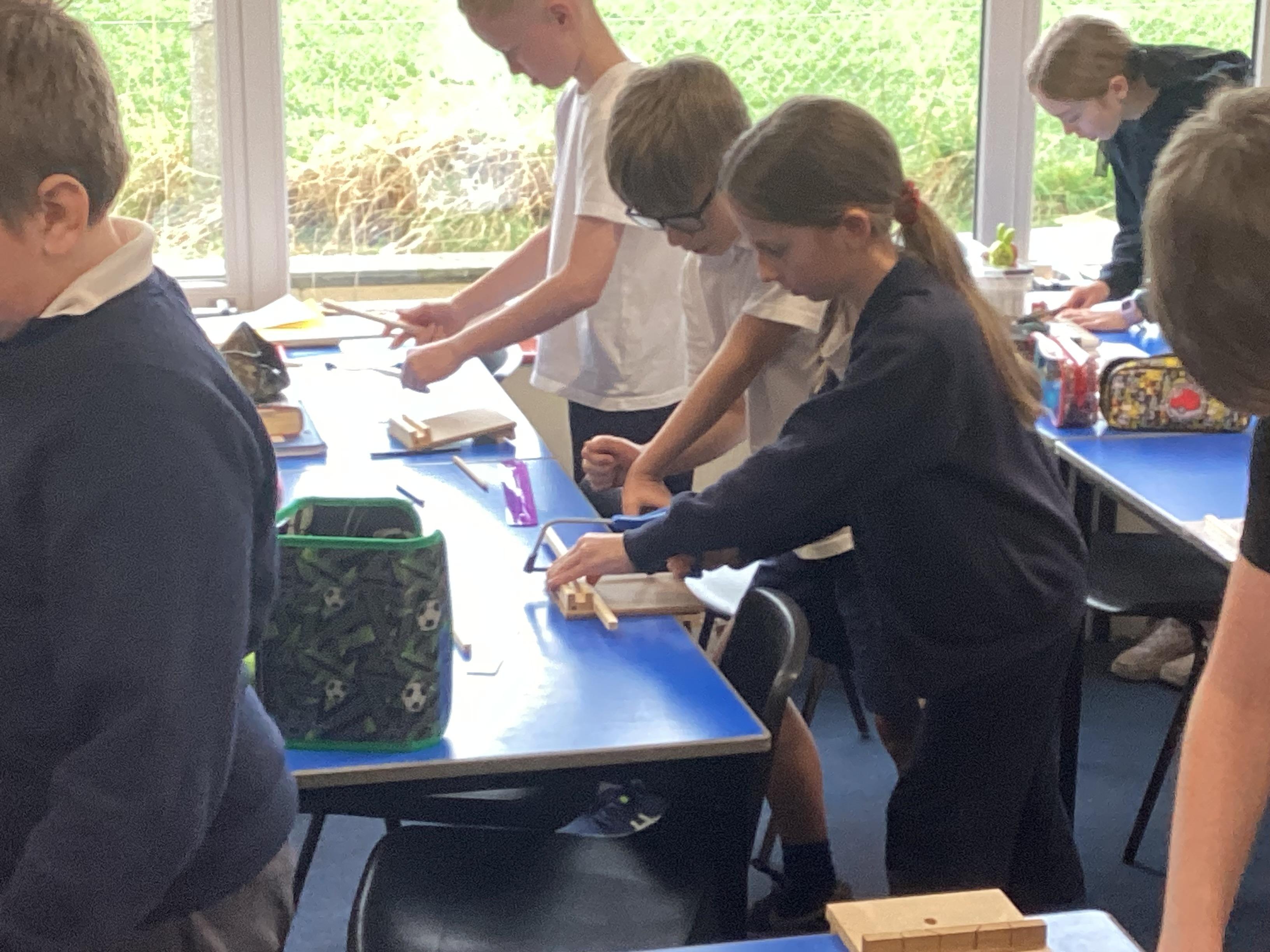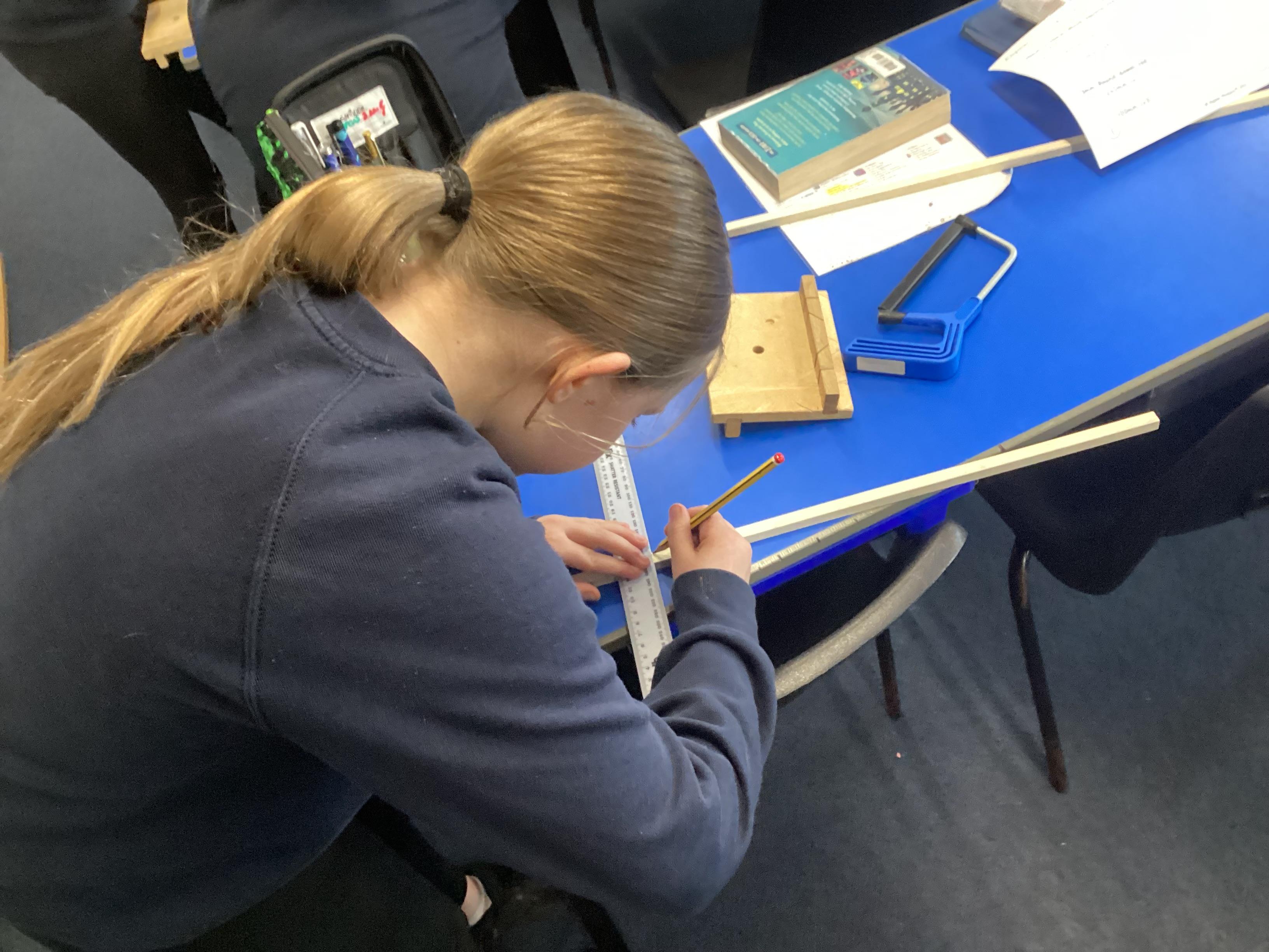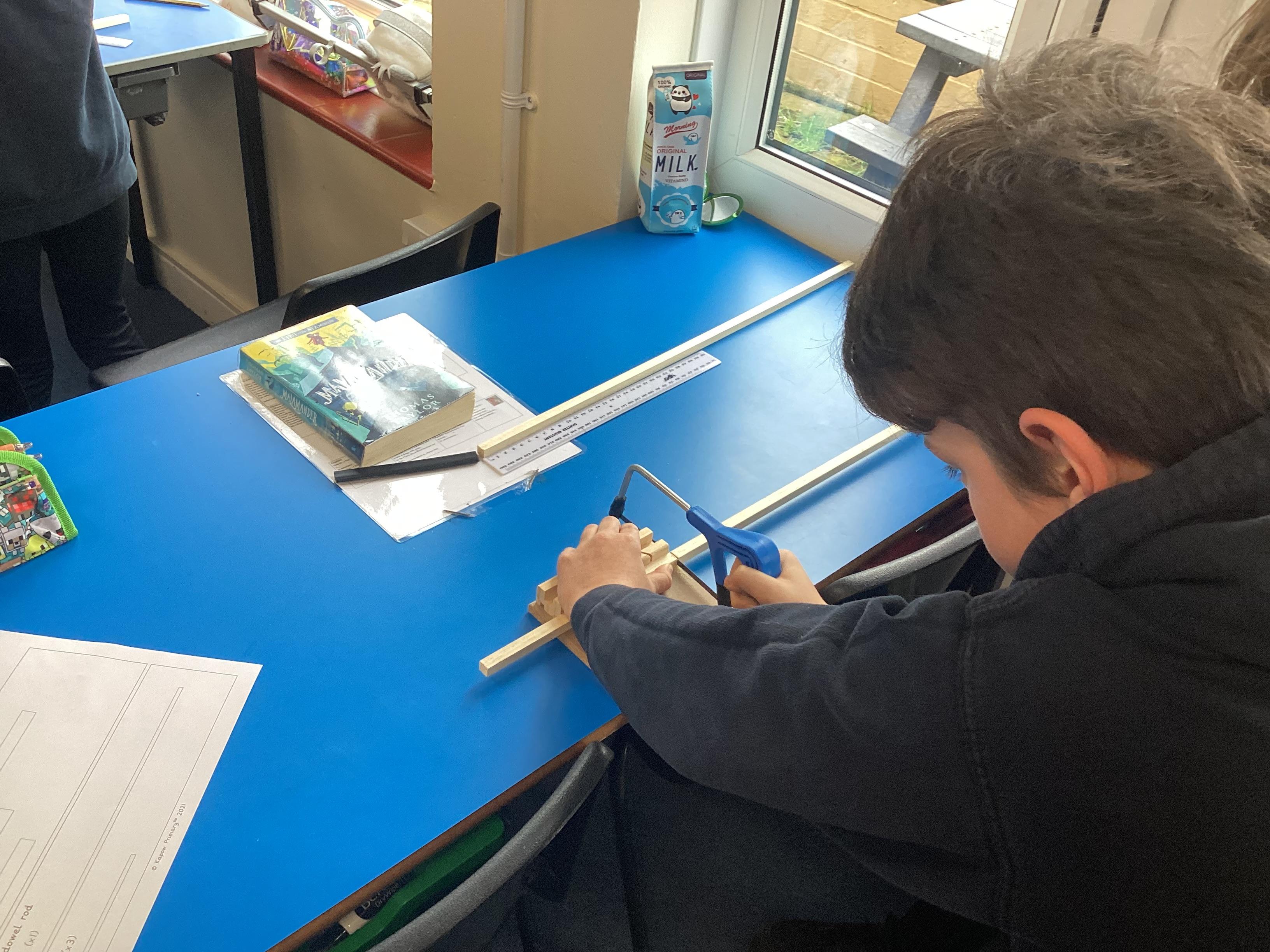 In D&T, Class 4 are designing and making their own 'automata toy'. Here we are measuring and cutting pieces of wood before we assemble the frame.