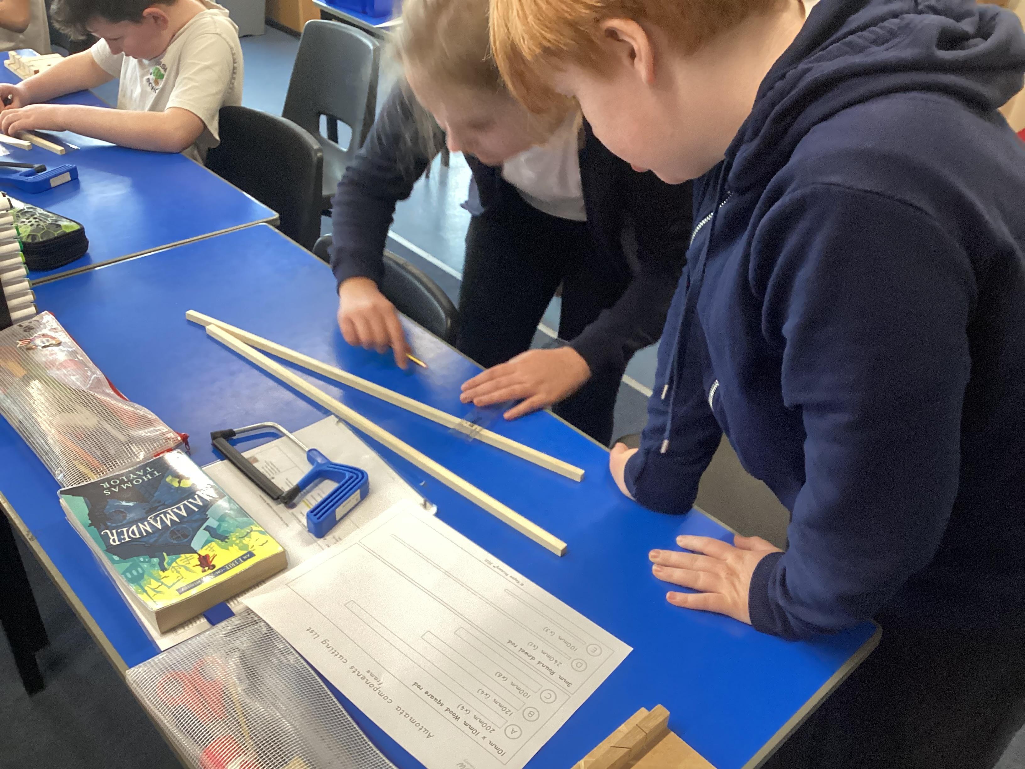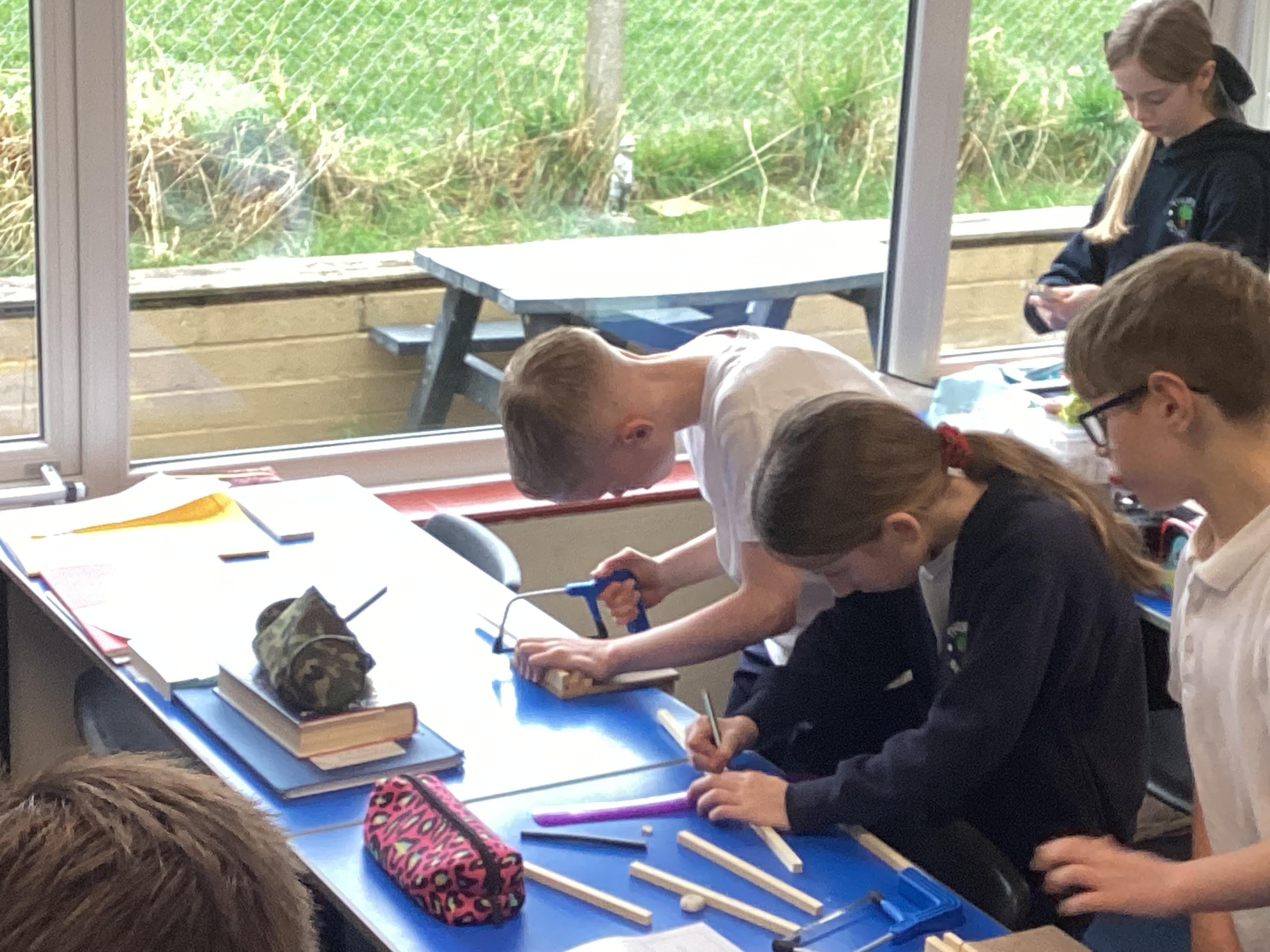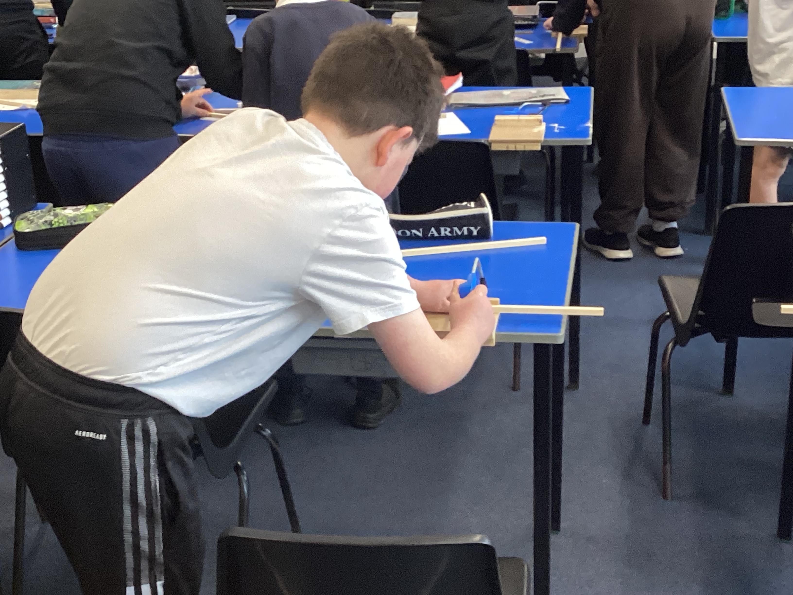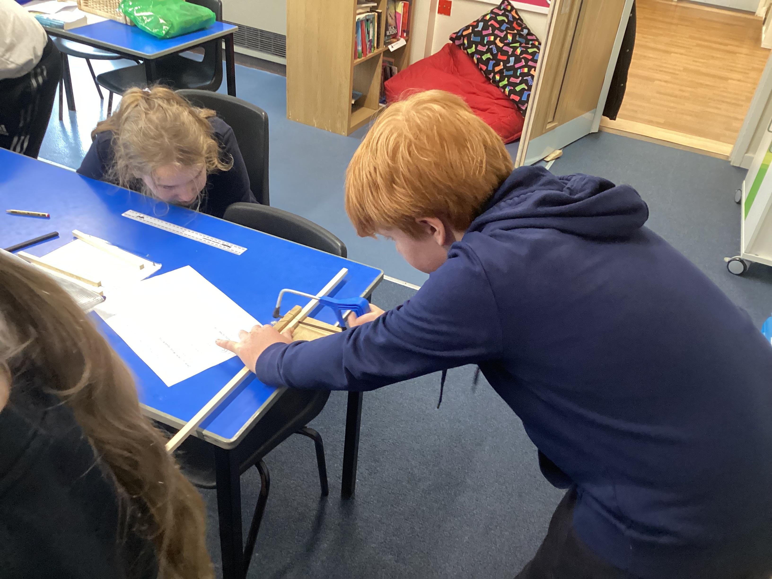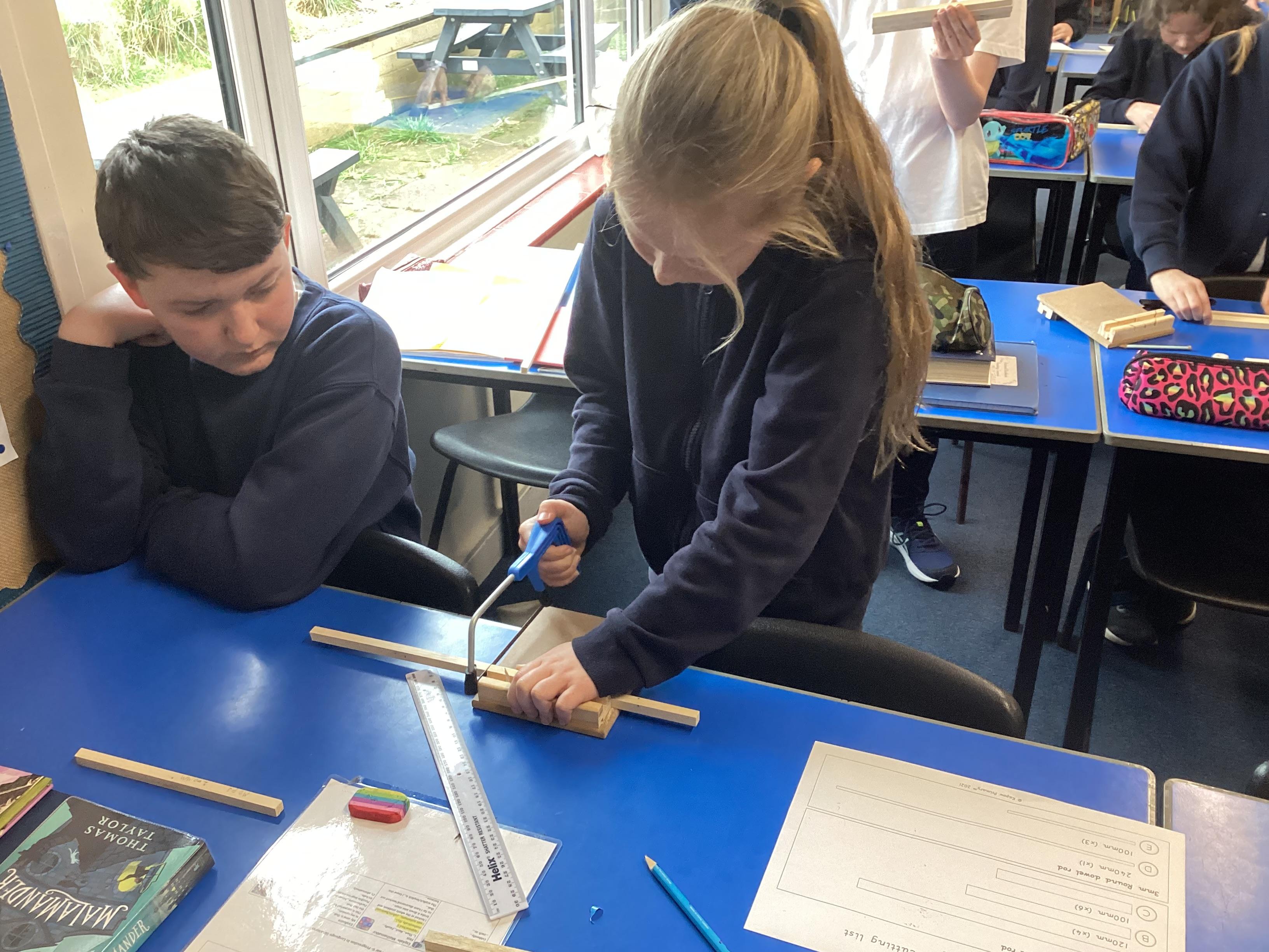 In D&T, Class 4 are designing and making their own 'automata toy'. Here we are measuring and cutting pieces of wood before we assemble the frame.